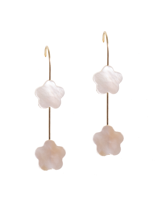 Brinco dourado haste curta, fio de metal banhado a ouro com aplicações de madrepérola em forma de flor.