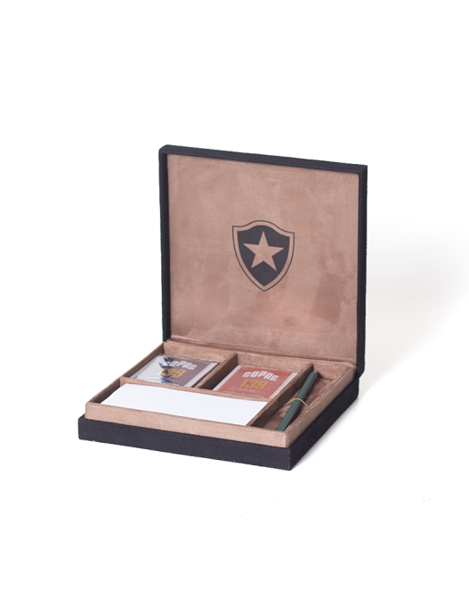 Porta-baralho em carmurça preta com baralho, bloco de papel e lápis. Gravação de escudo de diversos times, consulte as opções.