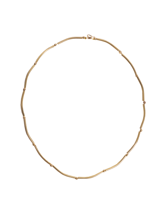 Colar dourado com cano e bolinhas d emetal intercaladas.