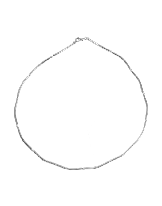 Colar prateado com cano e bolinhas d emetal intercaladas.